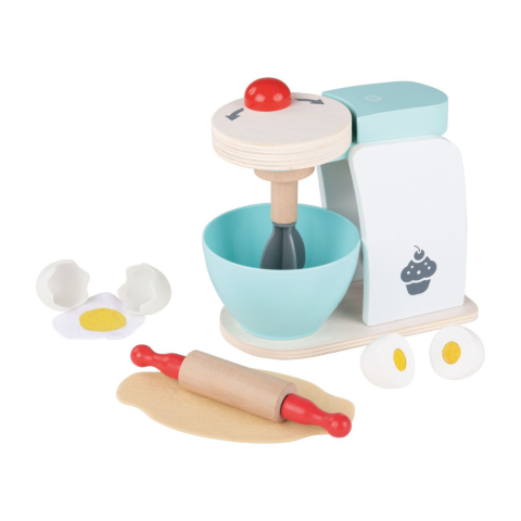 Játék konyhai robotgép fából a kis szakácsoknak! Igazán dizájnos, tartós fa játék, mely vidám kalandot ígér a sütés-főzés iránt érdeklődő gyermekek számára. Tartozékai között szerepel a sütéshez elengedhetetlen nyújtófa, tészta, tojás, és a kivehető kever