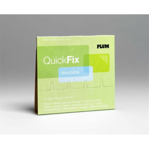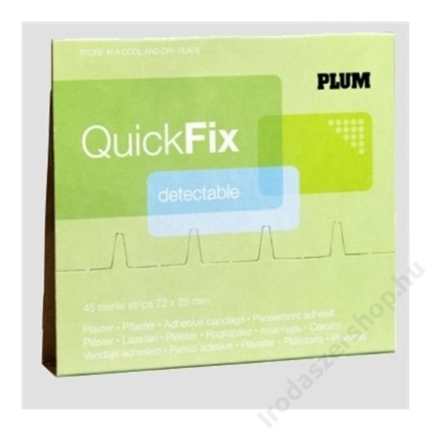 Sebtapasz utántöltő Quick Fix, 45 darabos, kék, fémszálas, PLUM (ME7073) KÉK Quick fix adagolóhoz tárolható szerszámos ládában, elsősegély dobozban, kesztyűtartóban, fiókban, vagy táskában a KIMUTATHATÓ FÉMSZÁLAS RAGTAPASZ STERIL és olyan munkahelyekr
