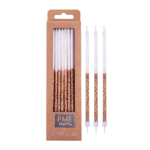 PME glitter gyertya, extra hosszú, rose gold 16db Ezek a klasszikus fehér csillogó gyertyák merész és kifinomult megjelenést kölcsönöznek a tortáidnak és süteményeidnek, természetesen némi fényes csillogással, hogy a tortád kitűnjön a tömegből!Magasság