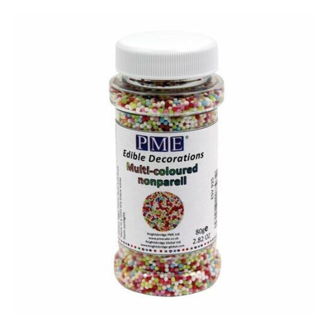 PME Nonpareils, színes, 80g Ezek a PME vidám nonparels nemcsak a sütemények díszítésére, hanem fagylaltokhoz és desszertekhez is nagyszerűek. Összetevők: cukor, keményítő (búza/kukorica), glükózszirup , színezékek (alma, retek, szaflore, spirulina, fek