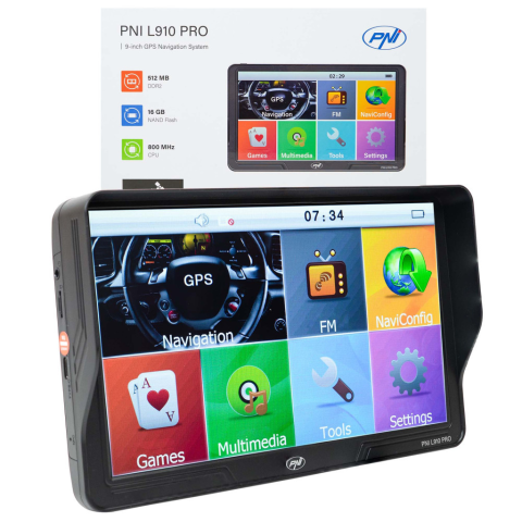 GPS navigációs rendszer, 7 hüvelykes képernyő, 800 MHz, 256 MB DDR, 16 GB belső memória, 2100 mAh, FM adó, napellenzővel, térkép nélkül! Tágas kijelző - Napellenző A PNI L910 PRO hordozható autós GPS- rendszer egy modern GPS-navigációs megoldás, amely