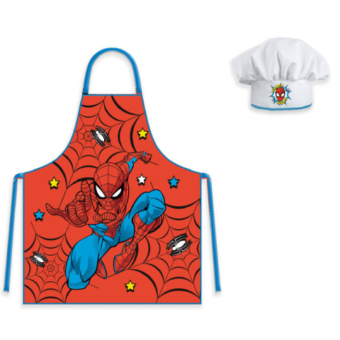 Spiderman, Pókember Gyerek kötény 2 darabos szett Anyaga: 100% poliészter Szett tartalma: - 1 db kötény - 1 db kuktasapka Ajánlott 3-8 éves korig. Csomagolt termék, ajándéknak is kitűnő.