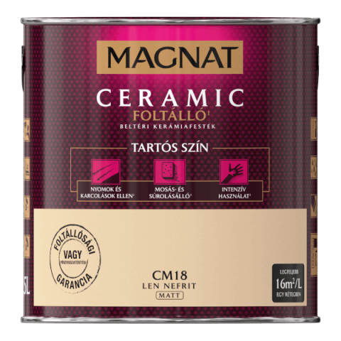 A MAGNAT KERÁMIAFESTÉK a cement, cement-mész, gipsz, gipsz-karton alapú falak és plafonok, valamint üvegszálas tapéták dekoratív-védő festéséhez alkalmazandó. Ugyanakkor alkalmazható fa, fa eredetű és fém beltéri felületek festéséhez.