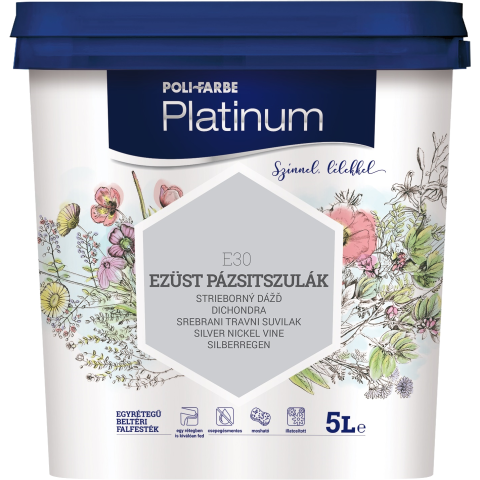 1 kép Poli-Farbe PLATINUM SZÍNES BELTÉRI DISZPERZIÓS FALFESTÉK 5L E30 EZÜST PÁZSITSZULÁK