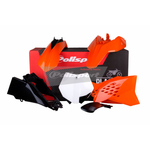 A Polisport műanyagok fröccsöntéssel készülnek, saját fejlesztésű technológiával. Az összes műanyag alkatrész a DGP (Tartós fényes polipropilén) anyagból készül, amely magas szintű ellenállást és fényes felületet biztosít nekik.Tartalmazza:- Első sárvédő- Hátsó sárvédő + oldalsó panelek- Radiátor borítások- Első lemez- Légdoboz borításOEM típusúUgyanazt használják a MXGP-ben.