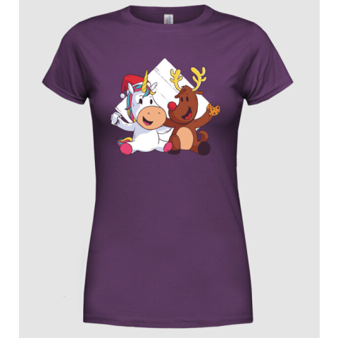 1 kép Pólómánia Unikornis és Rénszarvas barátság cuki karácsonyi póló - Női Kerek nyakú Póló