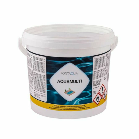 Az Aquamulti hármas hatású lassan oldódó 200 g-os klórtabletta mely: pelyhesíti a lebegő szennyeződéseket, gátolja az algák megtelepedését és szaporodását, valamint 90%-os aktív klórtartalmával fertőtleníti a vizet. Nagyobb kültéri