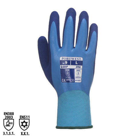 A Portwest AP80 Liquid Pro egy 100%-ban vízálló, duplán mártott latex védőkesztyű, amelyet a kivételes tapadás és a magas kézügyesség jegyében terveztek. A dupla bevonat szárazon tartja a kezet, míg a mikro-buborékos latex tenyérréteg extra tapadást garan