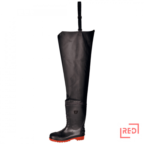 Nagy teljesítményű PVC/nitril biztosági mellescsizma acél orrmerevítővel és talplemezzel. Színkódolt piros talp, a védőképesség könnyű felismeréséhez. Állítható derék és pántok Rozsdamentes acélszemek Sarokvédő Színkóddal ellátott piros talp a biztonsá