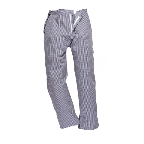 100 % Pamut pepita séfnadrág A Portwest C075 Barnet séfnadrág meleg munkakörnyezetre tervezett 100% pamut alapanyagból készülő ruházati termék. Kényelmes szabás, kiváló, komfortos viseletet biztosít a konyhai dolgozók, szakácsok, séfek számára. konyhai r