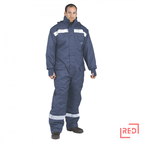 Strapabíró, kényelmes hűtőházi overál. Fényvisszaverő csíkokkal rendelkezik a vállakon körben és lábszárakon. Nagyméretű zsebek a kesztyűben történő használathoz. Megerősített térdkialakítás és tépőzáras lábszárak, gumírozott hátsó derékrész. Mellzseb iga
