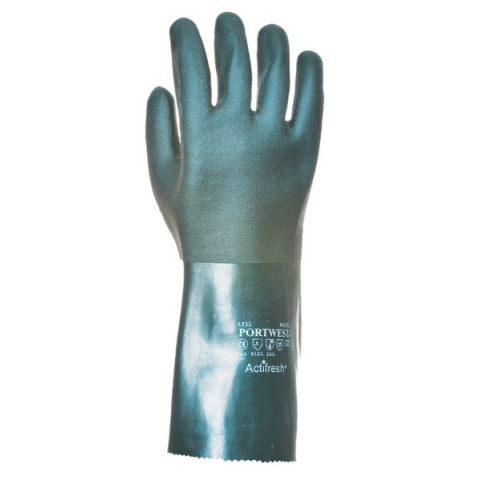 Duplán mártott vegyszerálló PVC munkavédelmi kesztyű csúszásmentesített tenyérrel. A strukturált tenyérbevonat a jobb tapadást segíti elő. Actifresh jersey bélése kimagasló kényelmet biztosít. Szárhossza 45 cm. Ez a típus elérhető 27 cm-es, és 35 cm-e