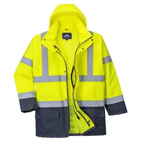 Kiváló ár-érték arányt képviselő 5 az 1-ben jól láthatósági munkavédelmi kabát (kontraszt színekkel). A külső kabáton praktikus tárolózsebek, patentos, állítható mandzsetta és rejtett kapucni található. A ragasztott varratok vízállóságot biztosítanak.