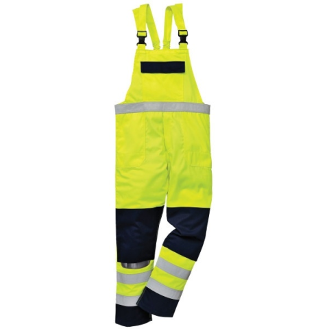 Portwest FR63 HiVis Multi-Norm munkavédelmi jól láthatósági mellesnadrág, fényvisszaverő csíkkal Cikkszám: FR63 - Az FR60 innovatív alapanyagból készülő új ''multi-norm'' melles nadrág modell. - Többféle kockázat ellen nyújt védelmet. - Duplán varrott