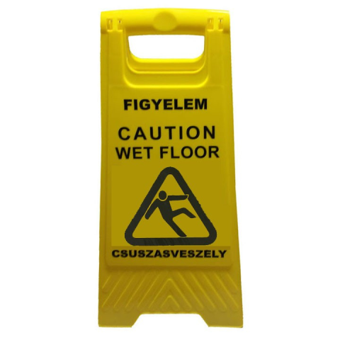 Csúszásveszélyre figyelmeztető tábla magyar nyelvű Csúszásveszély figyelmeztető tábla Mindkét oldalon magyar és angol feliratozással valamint nedves padló szimbólummal Strapabíró polipropilén 61 x 30 cm Praktikus könnyű műanyag tábla ami elengedhe