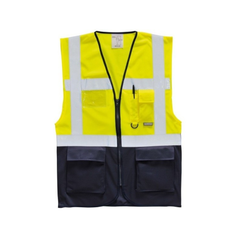 Poliészter jól láthatóságot biztosító munkavédelmi mellény, egyedi praktikus megoldásokkal: többfunkciós zsebek, mobiltelefon tartó zseb, cipzáros záródás. A dupla azonosítókártya tartó zseb lehetővé teszi álló és fekvő tájolású azonosító kártya elhel