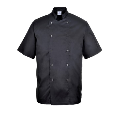 Meleg munkakörnyezetre tervezett, séfek részére tervezett rövidujjú kabát, mandaringallérral, többfunkciós, stílusos unisex fazonban. Klasszikus szabású, magas minőségű, könnyen kezelhető munkaruha modell, kopásálló, tartós, színtartó anyagból készül,