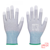 C szintű vágásbiztos kesztyű a vágások és éles tárgyak elleni védelemhez. 13g poliészter és szénszálas alapanyag, amely elvezeti a statikus elektromosságot. PU ujjbeggymártott a kiváló fogásbiztonságért. Autóipari, elektronikai összeszereléshez, tesztelés