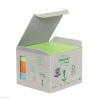 Post-it® kizárólag újrafelhasznált papírból! A minitornyokkal most a kisebb irodáknak is lehetősége nyílik környezetbarát döntést hozni. 76 x 76 mm méretű, vegyes színű lapok, 100 lapos tömbök, 6 tömbös kiszerelés. .