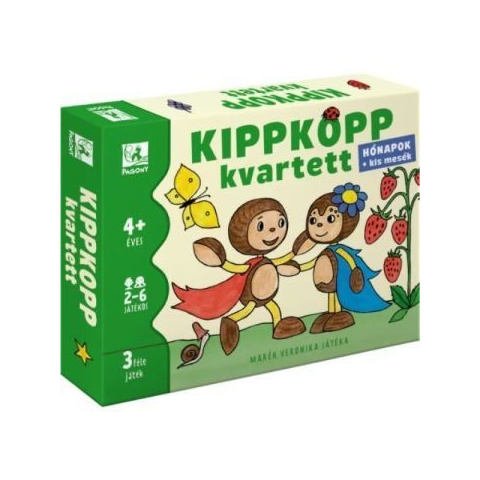 Kippkopp és Tipptopp januárban hóembert épít, júniusban szamócát szed, októberben szüretel, decemberben fát díszít. Gyűjtsd össze a kvartetteket – aki a legtöbbet megszerzi, az nyer! Meglátod, minden hónap egy-egy mese, amit a játék után el is olvashattok a mesefüzetben. A dobozban 3 játékverzió található: a Papucs a legkisebbeknek, a kétféle kvartett pedig kicsiknek és nagyoknak egyaránt tökéletes szórakozás!