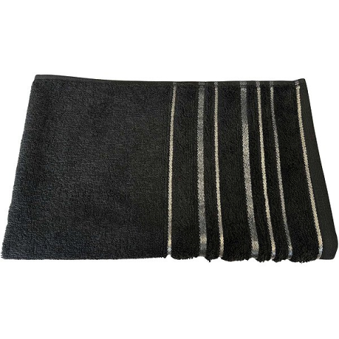 Törölköző - hagyományos, anyaga pamut, szárítógépbe tehető, akasztófüllel és nedvszívó, csíkos motívum, méretek 40 × 60 cm, anyagsűrűség 450 g/m², fekete színben Az igényes kialakítású Praktik törölköző mérete 40 × 60 cm. Az akasztófülnek köszönhetően gyorsabb száradás jellemző rá használat után. Kiváló nedvszívó képességgel rendelkezik, így megbízhatóan felsz