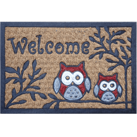 Természetes színnyomott, gumival hátoldalazott kókusz lábtörlő, Welcome bagoly mintával.
