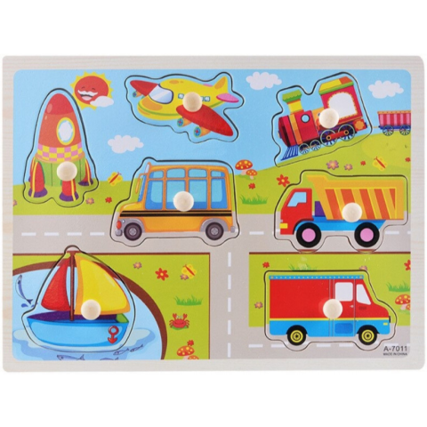 RAKTÁRRÓL AZONNAL! Fogantyús készségfejlesztő fa puzzle - Földön vizen levegőben Egy fogantyús puzzle, mely megismerteti a gyermekekkel a járműveket és formákat. A fogantyú segítségével könnyen a megfelelő helyre helyezhetőek vissza. A játék során gyermek