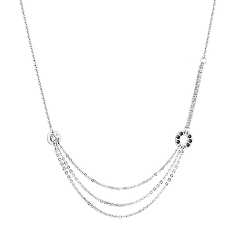 Középen három soros ezüst színű vékony nyakék, melyet a két oldalán fekete (jet) színű kristályokkal kirakott karikák fognak közre. A finom eleganciát kedvelő hölgyeknek ajánljuk. Rozsdamentes nemesacélból készült ékszer, cseh kristálykő, köbös cirkóni
