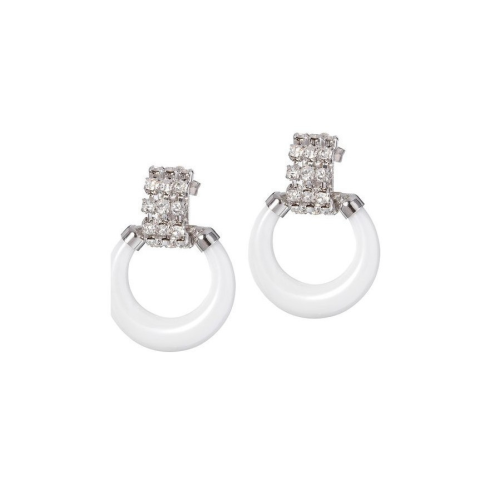 Kifinomultan elegáns, nőies fülbevaló, melyen egy fehér gyűrűt ölel egy ezüst színű, apró kövekkel kirakott függő. A dizájnja modern és stílusos, így tökéletes választás különleges alkalmakra vagy mindennapi viseletre. A hozzá tartozó nyaklánccal teheti t