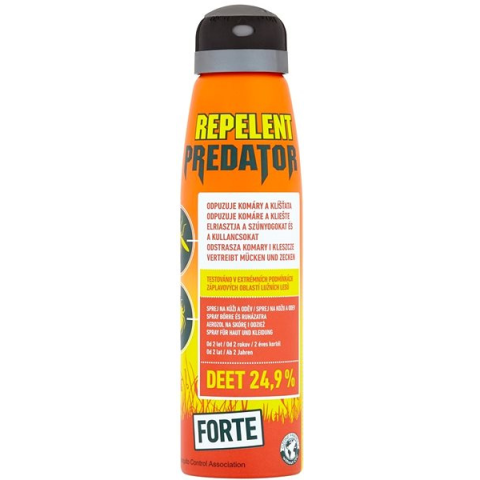 Rovarriasztó - kullancsok és szúnyogok ellen, gyermekek számára alkalmas, DEET-et tartalmaz és érzékeny bőrre alkalmas, DEET tartalom 25 %, spray, illatosított, alkalmazása bőrre és ruhára, űrtartalma 150 ml, alkalmas 12 éves kortól A nyár sajnos nemcsak a napsütésről, hanem a kellemetlen rovarokról is szól. Az enyhén illatosított PREDATOR Forte rovarriasztó hatékony védelmet nyújt. Elriasztja a szúnyogokat és a kullancsokat. A r