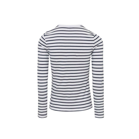 NŐI FELHAJTOTT UJJÚ PÓLÓ Szövet82% poliészter, 14% viszkóz, 4% elasztánFehér/tengerészkék, fonalfestett csíkos kivitelTulajdonságokFeltekerhető ujj, a felkaron gombbal és pánttal rögzítveLekerekített nyak háromgombos pánttalBordázott szegélyű nyak és m