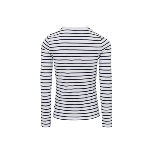 Premier Női gombos nyakú felgombolható hosszú ujjú sztreccspóló, Szövet82% poliészter, 14% viszkóz, 4% elasztánFehér/tengerészkék, fonalfestett csíkos kivitelTulajdonságokFeltekerhető ujj, a felkaron gombbal és pánttal rögzítveLekerekített nyak háromgombo