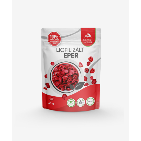 Vitaminokban gazdag, roppanós, fagyasztva szárított gyümölcs. Kiváló snack, granolák, műzlik alapanyaga és desszertek díszítésére is kíválóan alkalmas. Összetevők: 100% liofilizált eper PREMIUM NATURA termékeik gyártása, csomagolása során kizárólag