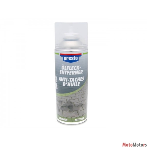 Presto olajfolt eltávolító spray - 400mlGyártó: PrestoLeírás:A Presto olajfolt eltávolító spray - 400ml az olajfoltok hatékony tisztítására lett kifejlesztve, legyen szó betonról, betonkoszorúról, tégláról vagy kerámia burkolatokról. Különösen alkalmas műhelypadlók tisztítására. A Presto spray erős oldó és szívó hatással rendelkezik, és egyszerűen használható az irányított permetezésnek köszönhetően.Termék tulajdonságai: Kémiai adatok: diaszp