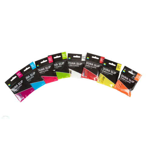 A Preston dura slip hybrid elastic gumicsalád 8 tagból áll, széles mérettartományt felölelve. Tulajdonságai ötvözik az erőt, a tartósságot és a nyúlási képességet, hogy tökéletes szilárdságot biztosítson akár a keszeg, kárász, akár a pontyhorgászat során. A gumikat előzetesen csúszás növelő olaj réteggel vonták be, így növelve a tartósságát akár szélsőséges körülmények között is. Hossza 3m