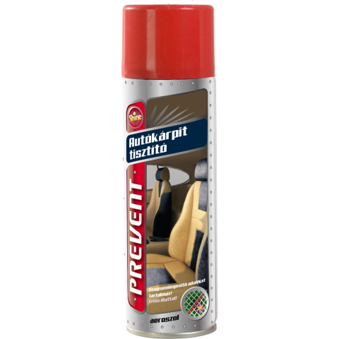 PREVENT autókárpit tisztító aerosol: Tartalma: 300 ml e, Méret: 5,6 cm x 28 cm, Súly:0,39 kg Paraméterek, tulajdonságok:propán-bután hajtógáz, anionos tenzidek, polimer diszperzió, illat, víz. Felhasználási terület:A termék mélyen a szálak közé hatolva távolítja el a szennyeződéseket a természetes és műszálas alapú kárpitból, szőnyegből. A felület visszanyeri eredeti tisztaságát, élénk, selymes színeit. Az aeroszol hagyományos szórófejes és speciáli