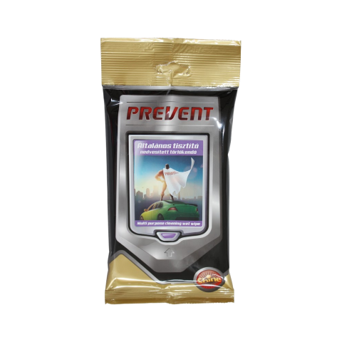 Prevent általános tisztító, nedvesített törlőkendő, 20 db. Műanyag, műbőr, gumi, fém és festett felületekről eltávolítható a porlerakódás, sáros, olajos, zsíros szennyeződés.