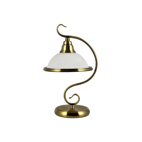 A Viola Prezent 75356 egy klasszikus stílusú asztali lámpa, amely arany színű inda mintázattal és fehér üvegbúrával rendelkezik. A lámpatest magassága 39 cm, átmérője 25 cm, tömege 1,5 kg. A termék fém és üveg anyagok felhasználásával készült, E14 foglala
