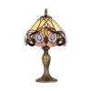 Ez a Tiffany asztali lámpa kézzel készült ólomüveg burával és antikolt fém talppal rendelkezik. Színes mintázata kellemes hangulatot teremt. Ideális éjjeliszekrényre, íróasztalra vagy nappaliba. Meleg, szűrt fényt biztosít, amely pihentető atmoszférát ere..