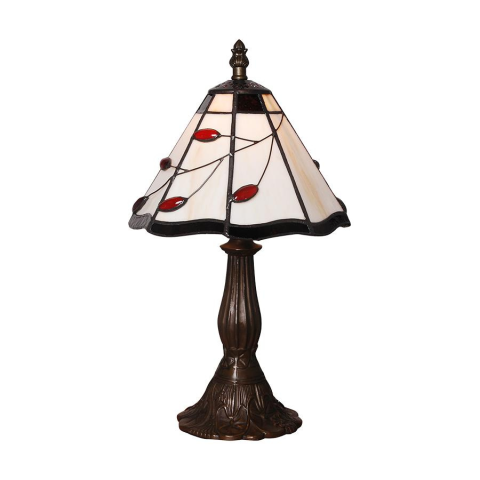 Ez a Tiffany asztali lámpa kézzel készült ólomüveg burával és antikolt fém talppal rendelkezik. Színes mintázata kellemes hangulatot teremt. Ideális éjjeliszekrényre, íróasztalra vagy nappaliba. Meleg, szűrt fényt biztosít, amely pihentető atmoszférát ere..