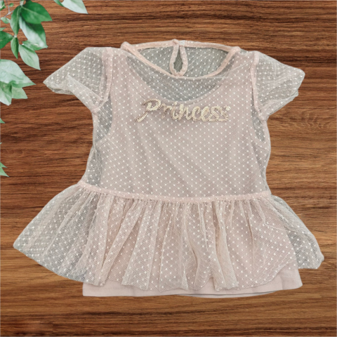 Tüllős, flitteres felső Egyenes szabású, kerek nyakkivágású, alúl hozzávarrt toppal. Hibátlan állapotú.