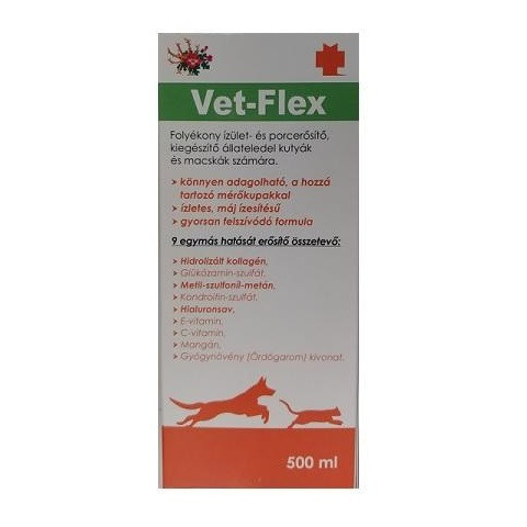 A Vet-Flex Folyékony ízület- és porcerősítő egy kiegészítő állateledel kutyák és macskák számára. - könnyen adagolható, a hozzá tartozó mérőkupakkal - ízletes, máj ízesítésű - gyorsan felszívódó formula 9 egymás hatását erősítő összetevő: Hidrolizá