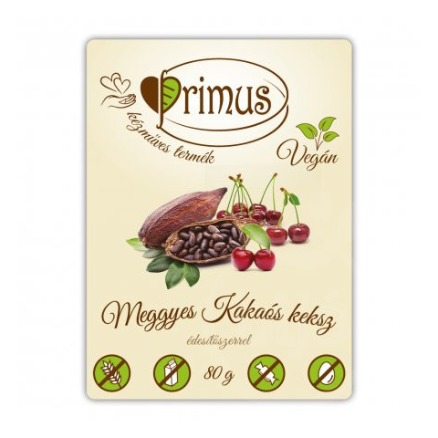 Primus vegán meggyes-kakaós keksz 80 g KÉZMŰVES Vegán Meggyes Kakaós keksz édesítőszerrel Csökkentett szénhidráttartalmú Összetevők: tápióka keményitő, mandula, eritrit, kókuszolaj, kókuszőrlemény, kókuszkrém, aszalt meggy, kakaópor (2,5 %), só,