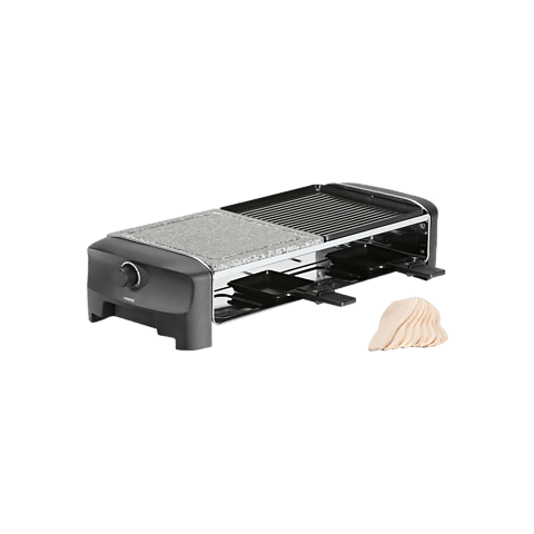 Ez a Princess márkájú Raclette elektromos főzőlap a klasszikus grillsütő, a kő, a teppanyaki és a raclette meglepő kombinációja, 8 személy számára alkalmas. A főzőlap 2 különböző főzőfelülettel rendelkezik - egy öntött alumíniumból készült grillfelület és egy másik Raclette- típusú felület, amely sima és kőből készült. Így a 42 x 21 cm- es felületén különböző ételeket készíthet egyszerre, a főzőlap ideális 8 adag elkészítéséhez. A főzől
