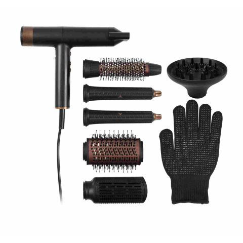 Multifunkciós hajformázó - hálózati tápellátás, 2000 W-os teljesítmény, ionizálás, hideg levegő, automatikus forgás, göndörítés, hőmérséklet szabályozás, légáramlás szabályozás, olvadóbiztosíték, 3 állítható hőmérsékleti fokozat 40-110 °C közötti hőmérséklettel, 7 fajta kiegészítő is jár hozzá, konkrétan koncentrátor, hajkiegyenesítő kefe, formázó kefe, forrólevegős hajformázó, hullámosító fej és diffúzor is, 3 sebességfokozattal, 1