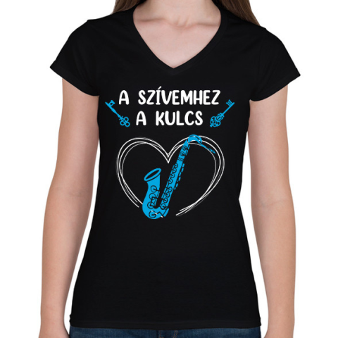 1 kép PRINTFASHION A szívemhez a kulcs - Szaxofon - Női V-nyakú póló - Fekete