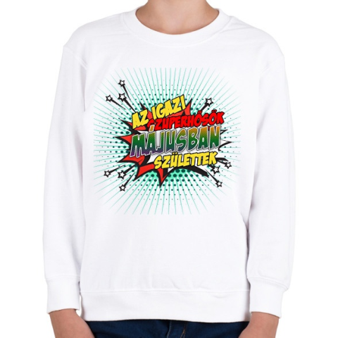 1 kép PRINTFASHION A szuperhősök májusban születtek - Gyerek pulóver - Fehér