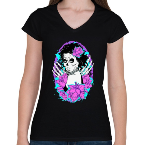 1 kép PRINTFASHION A virágos lány - Női V-nyakú póló - Fekete