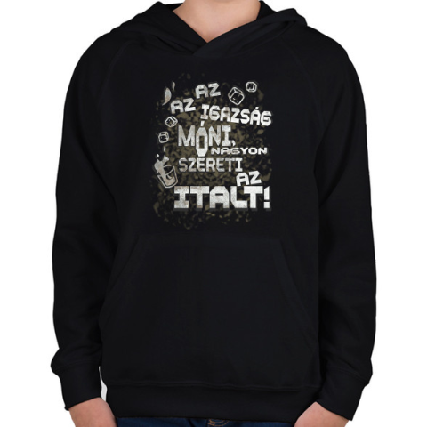 1 kép PRINTFASHION Az az igazság Móni, nagyon szereti az italt! - Gyerek kapucnis pulóver - Fekete