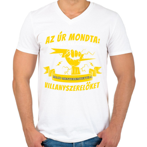 1 kép PRINTFASHION Az úr megteremtette a villanyszerelőket - Férfi V-nyakú póló - Fehér